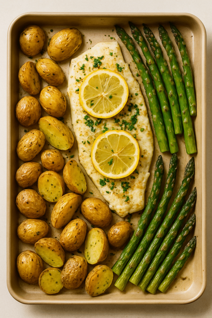 Baked Lemon-Garlic Cod + Herb Potatoes & Asparagus