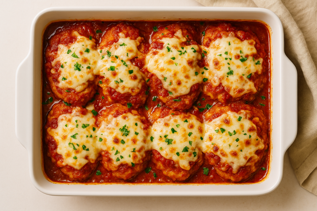 2. Layer cutlets in 9×13; top with marinara, mozz, Parmesan.